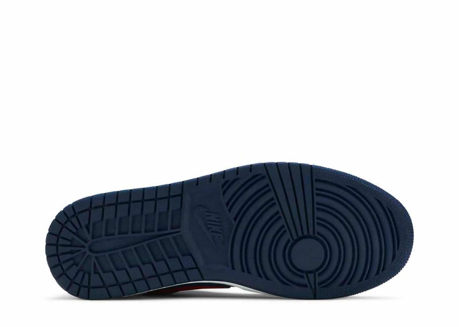 Air Jordan 1 Low with a “USA” theme. The Navy Blue nubuck upper of this Air Jordan 1 low-top is contrasted by White leather on the toe box and heels. The laces, nylon tongues, and rubber outsole are all navy, with red accents on the Jumpman and Swoosh.