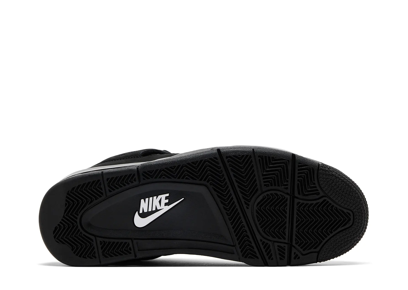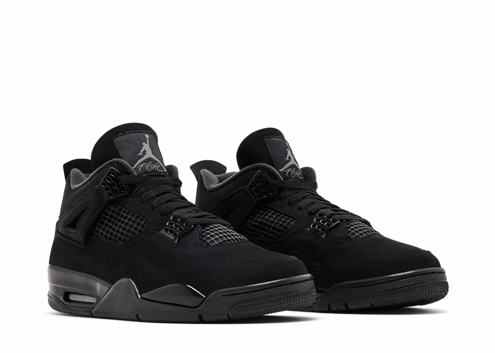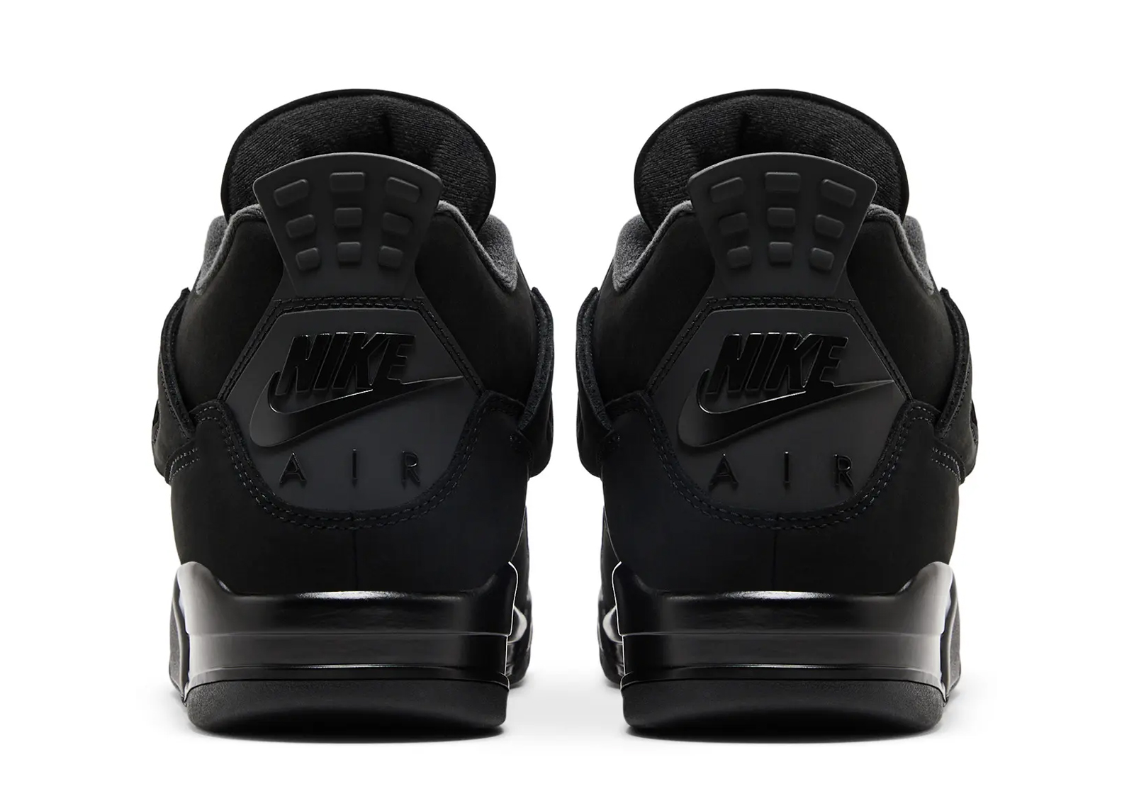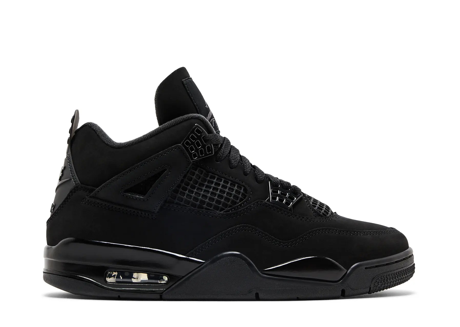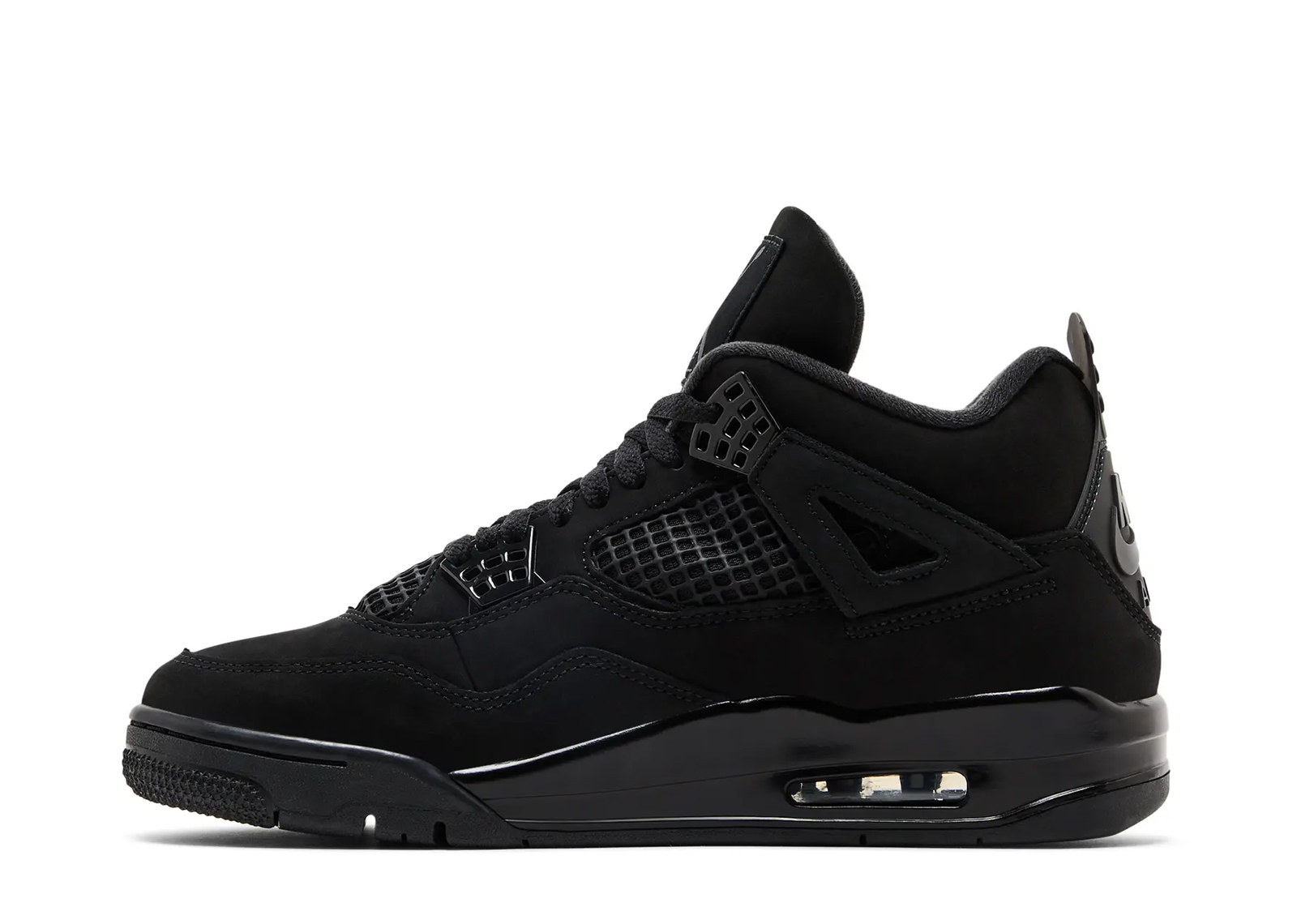The 2025 Air Jordan 4 Retro ‘Black Cat’ revives the classic 2006 colorway. Its upper is built from smooth black nubuck, complemented by original elements such as the mesh quarter panels, molded eyelets, and signature support wings. Subtle Jumpman logos appear on both the tongue label and heel tab. The all-black look continues onto the polyurethane midsole, which houses a visible Air unit in the heel for cushioning.