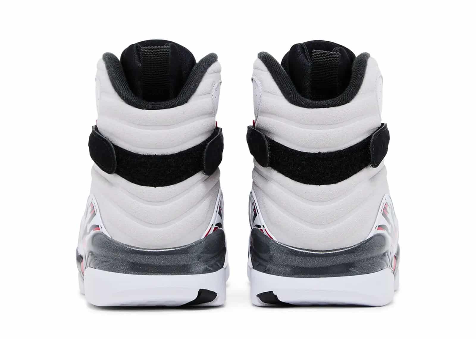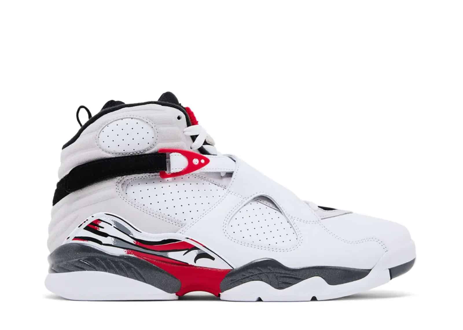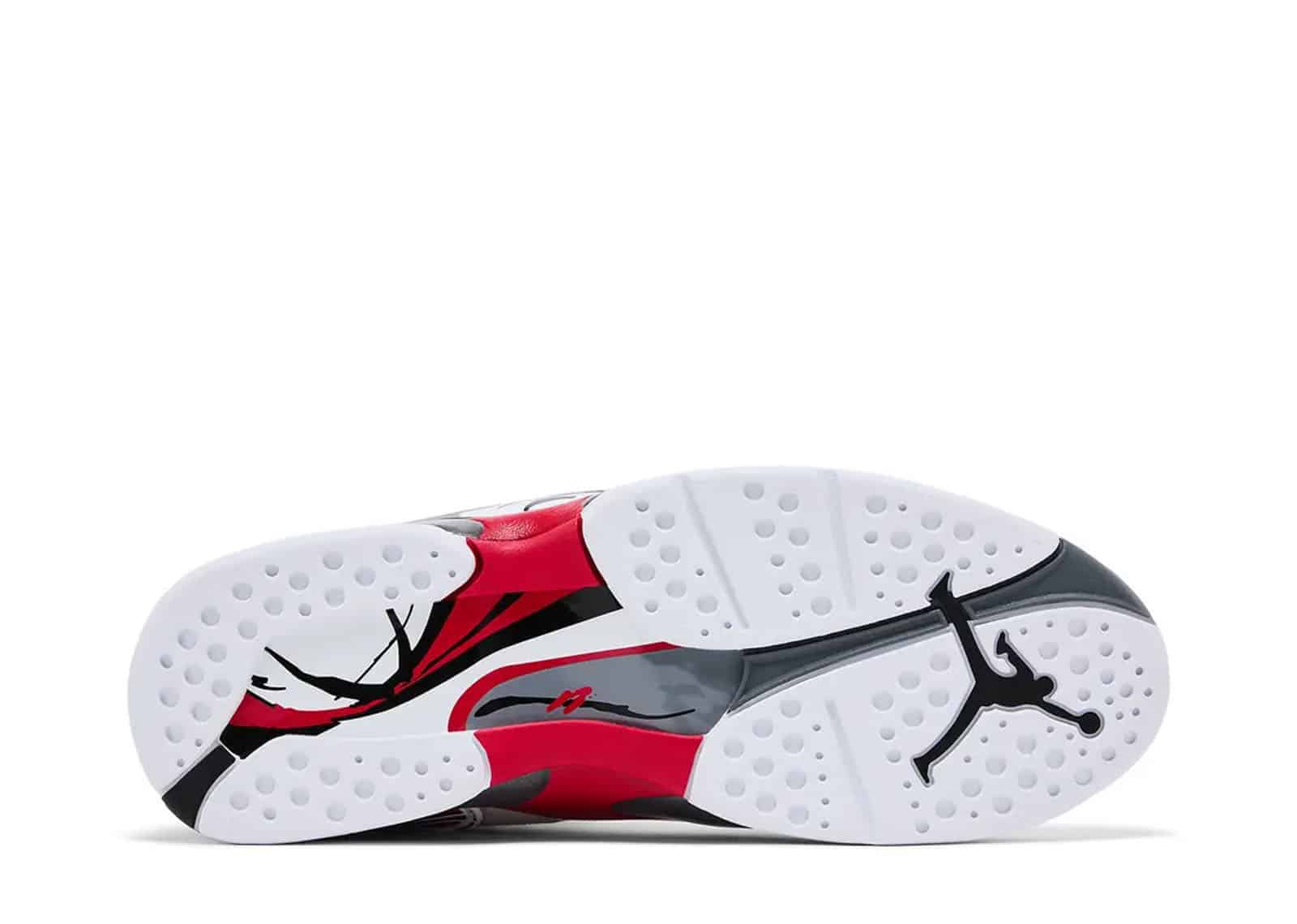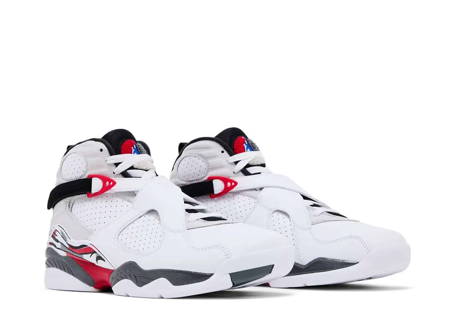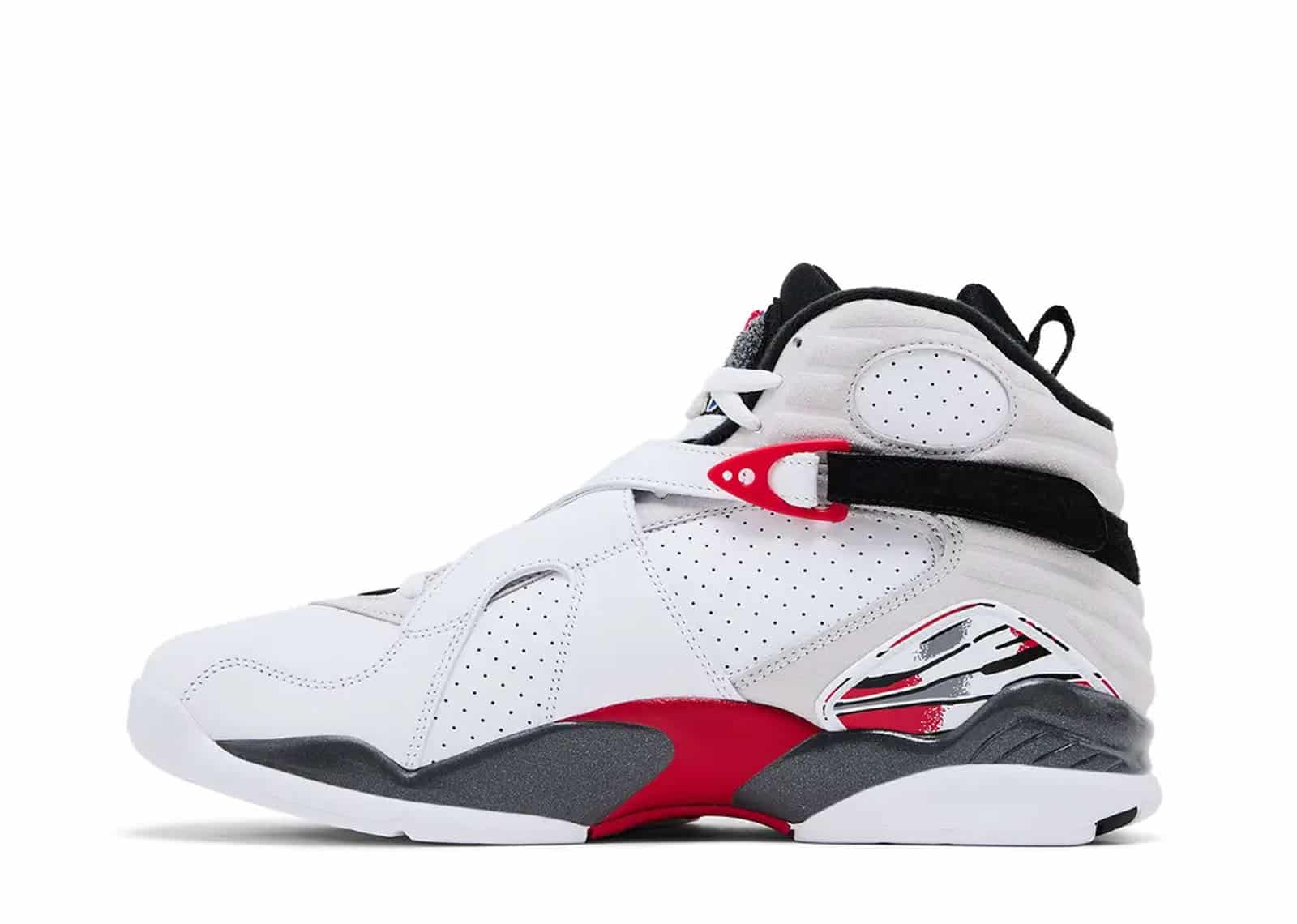 The Air Jordan 8 “Bugs Bunny” reissue from 2025 is identical to the original 1993 model. The classic model features a white leather upper that is accentuated with perforated detailing on the quarter panel and fastened with a special cross-strap design. The heel and collar are covered with a grey synthetic suede overlay. A multicolored chenille Jumpman tongue patch and white TPU overlays with a unique black, red, and grey brushstroke design that strengthen the medial and lateral heel are among the signature elements.