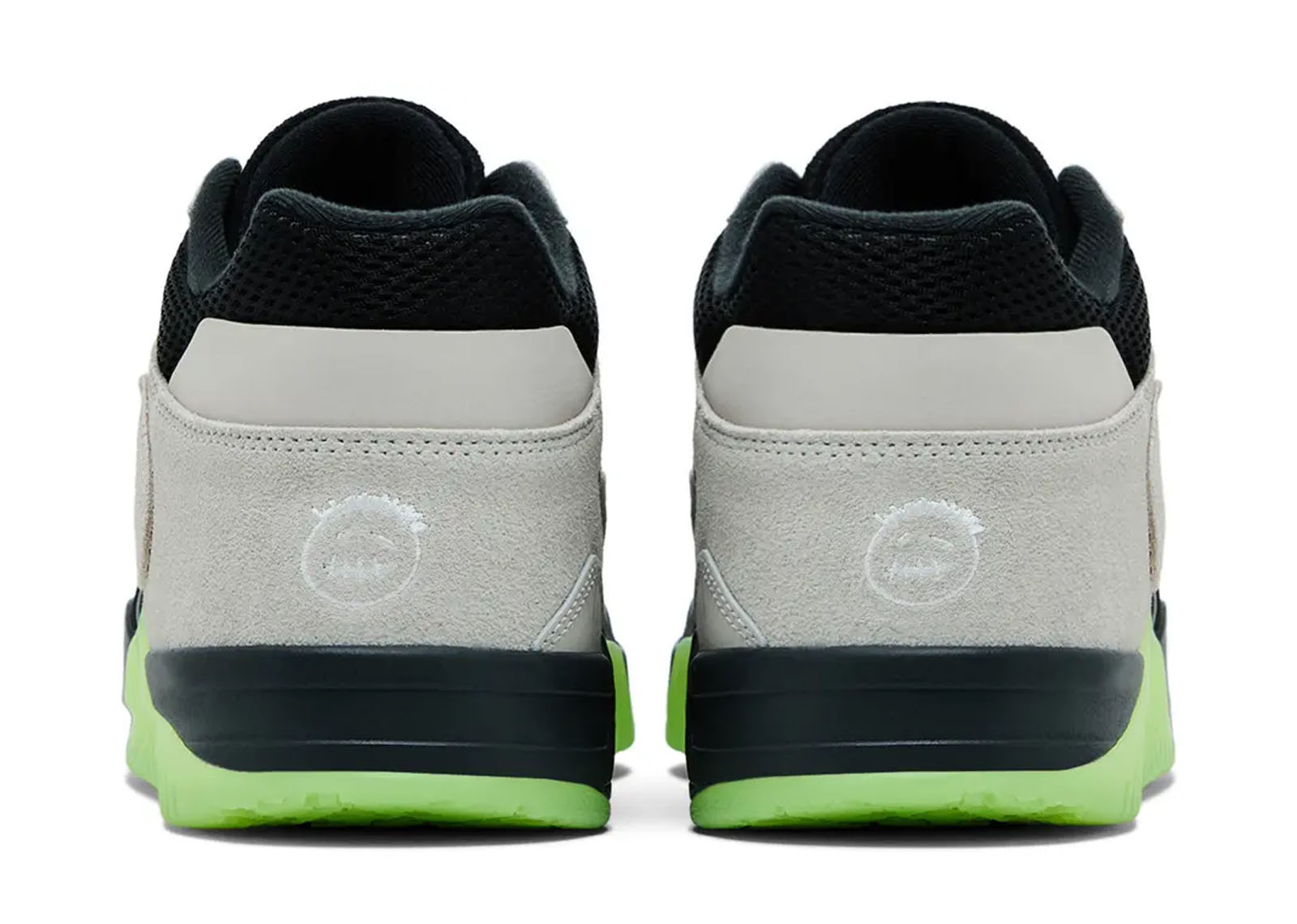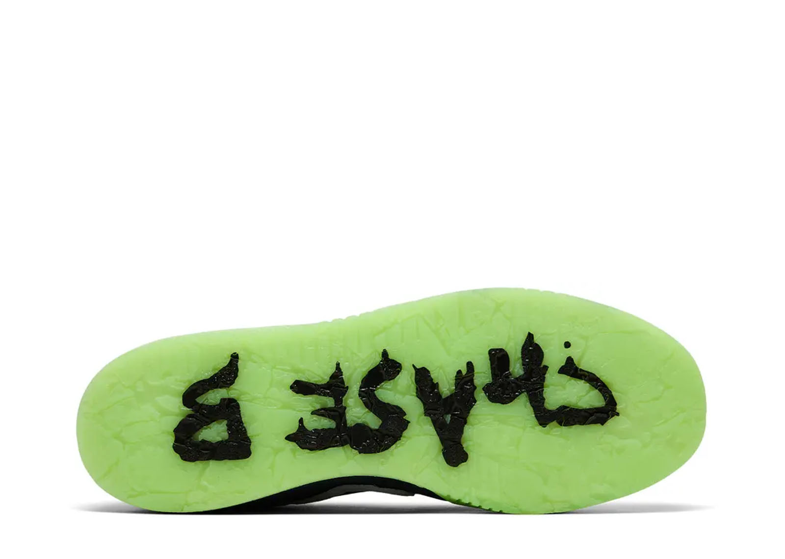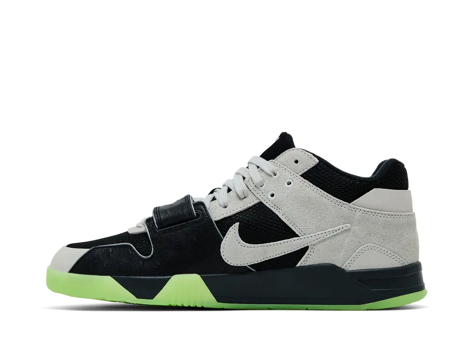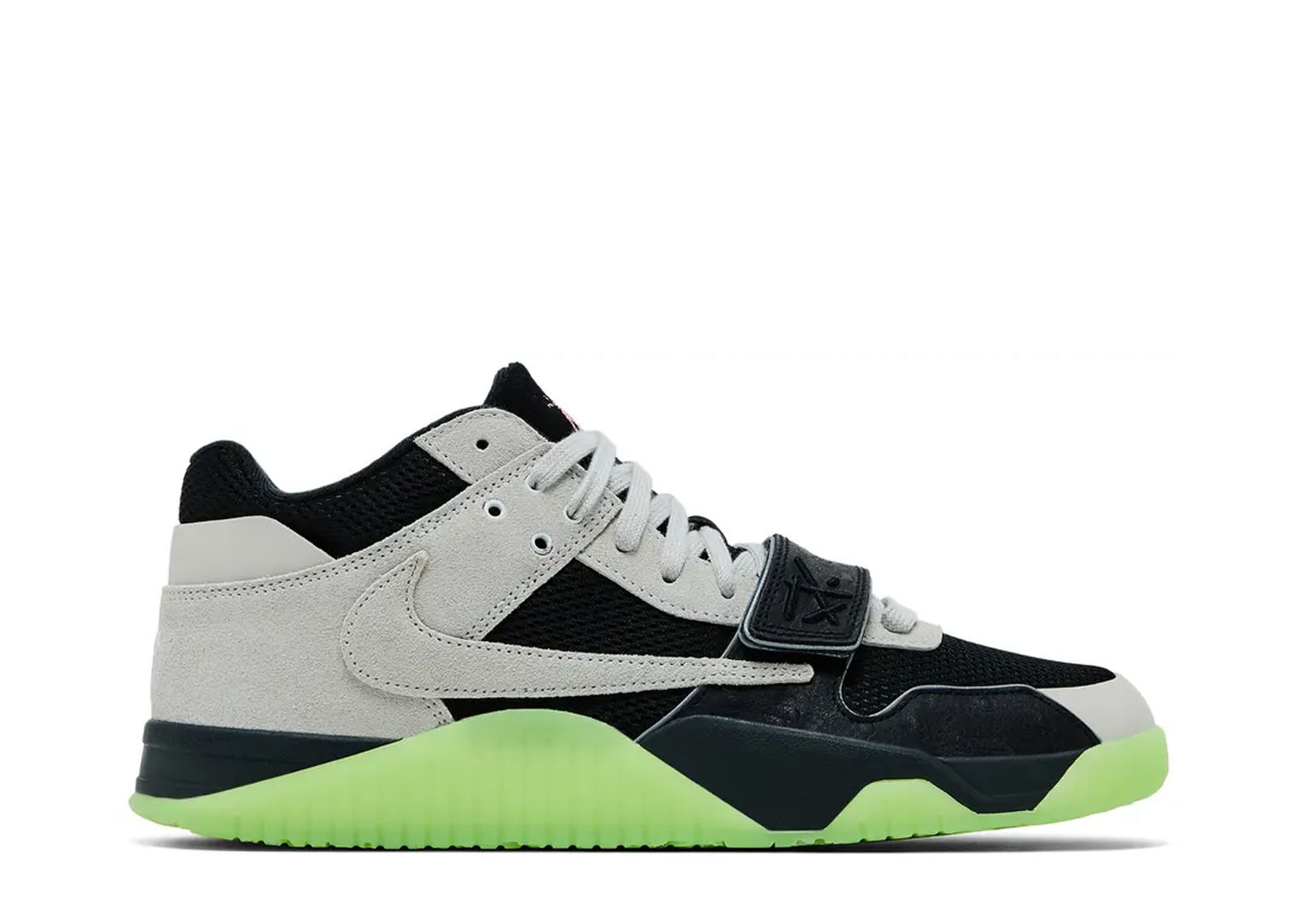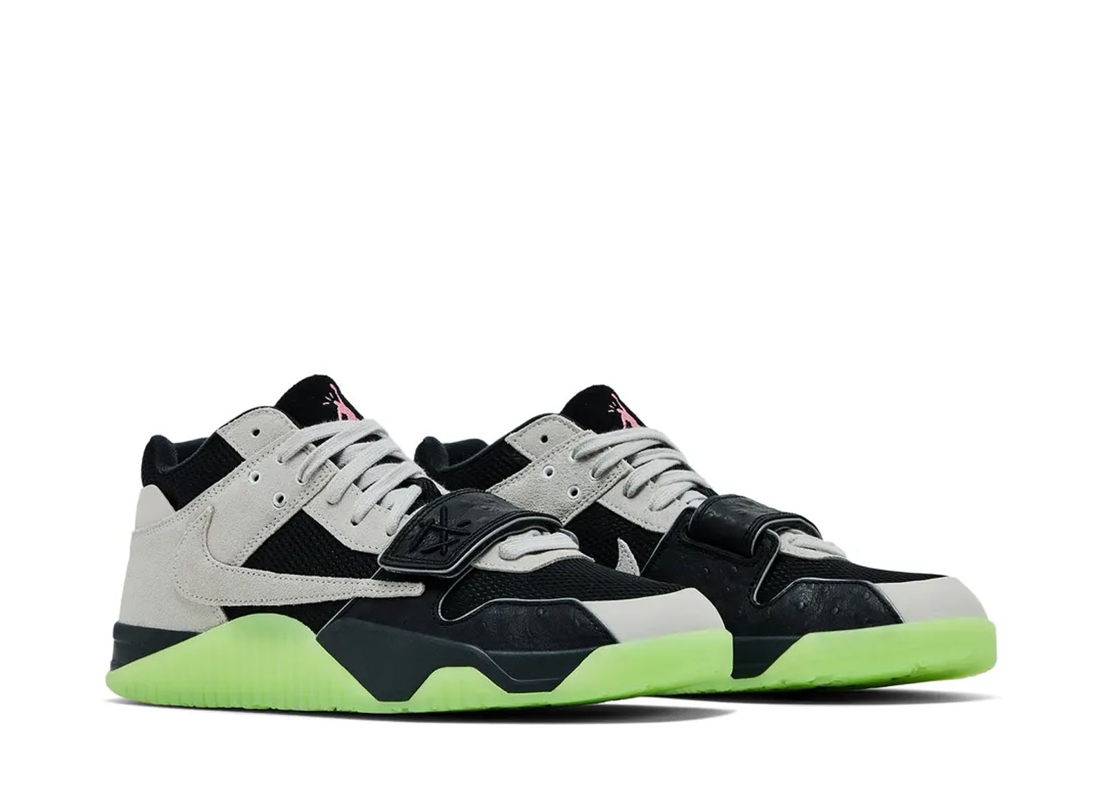 Jordan Jumpman x Travis Scott x Chase B The Jack TR ‘Black Night Silver’ has a mixed-material upper with an off-white suede structure and a breathable black mesh base. Reflective piping outlines an adjustable midfoot strap made of black ostrich leather. The tongue is adorned with a pink embroidered Jumpman, while the lateral side panel is adorned with a reverse off-white suede Swoosh. The black foam midsole is encased in a green-tinged glow-in-the-dark rubber outsole.