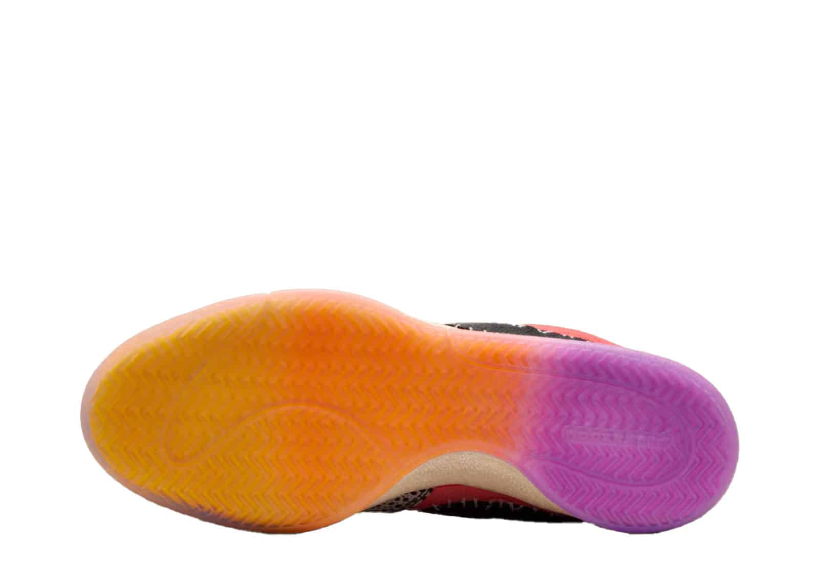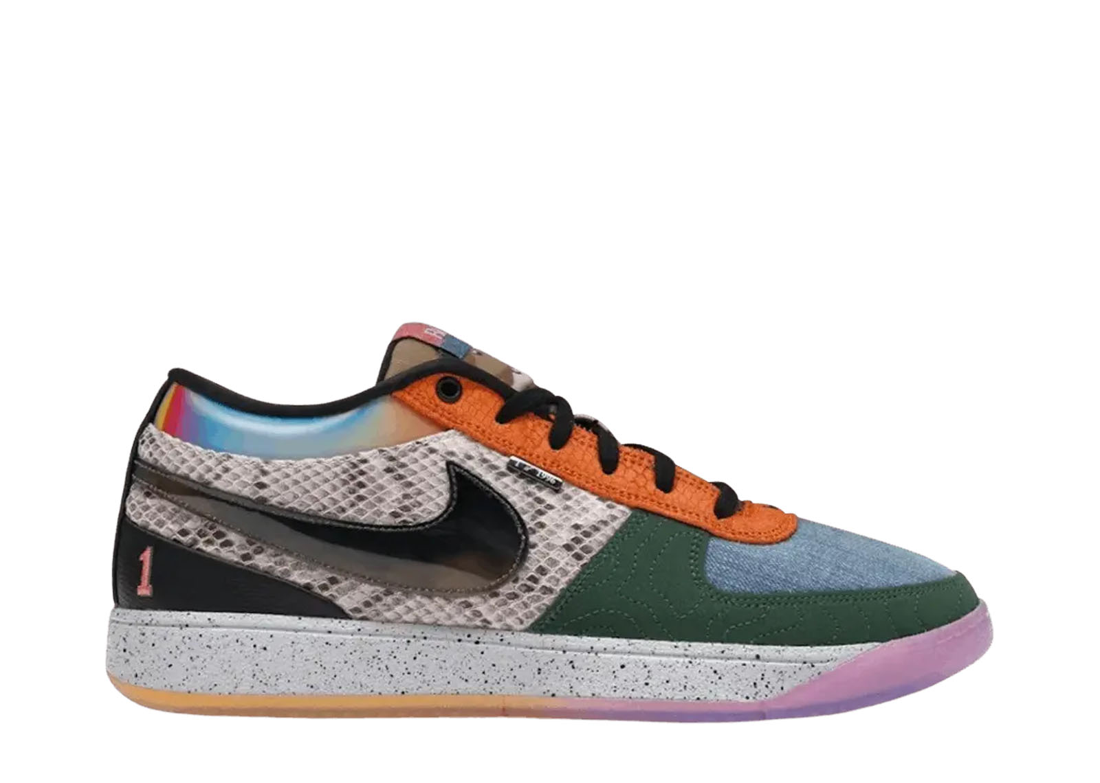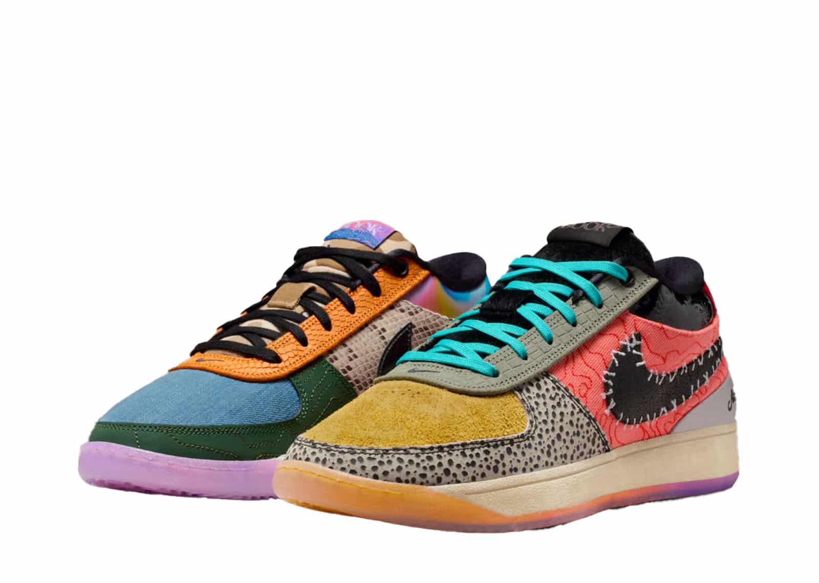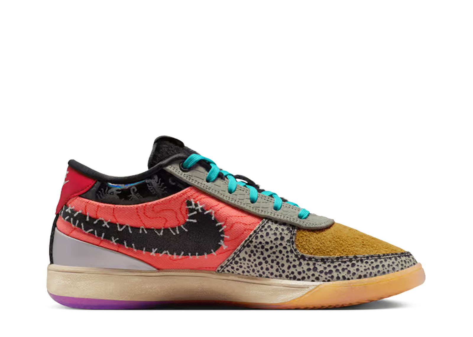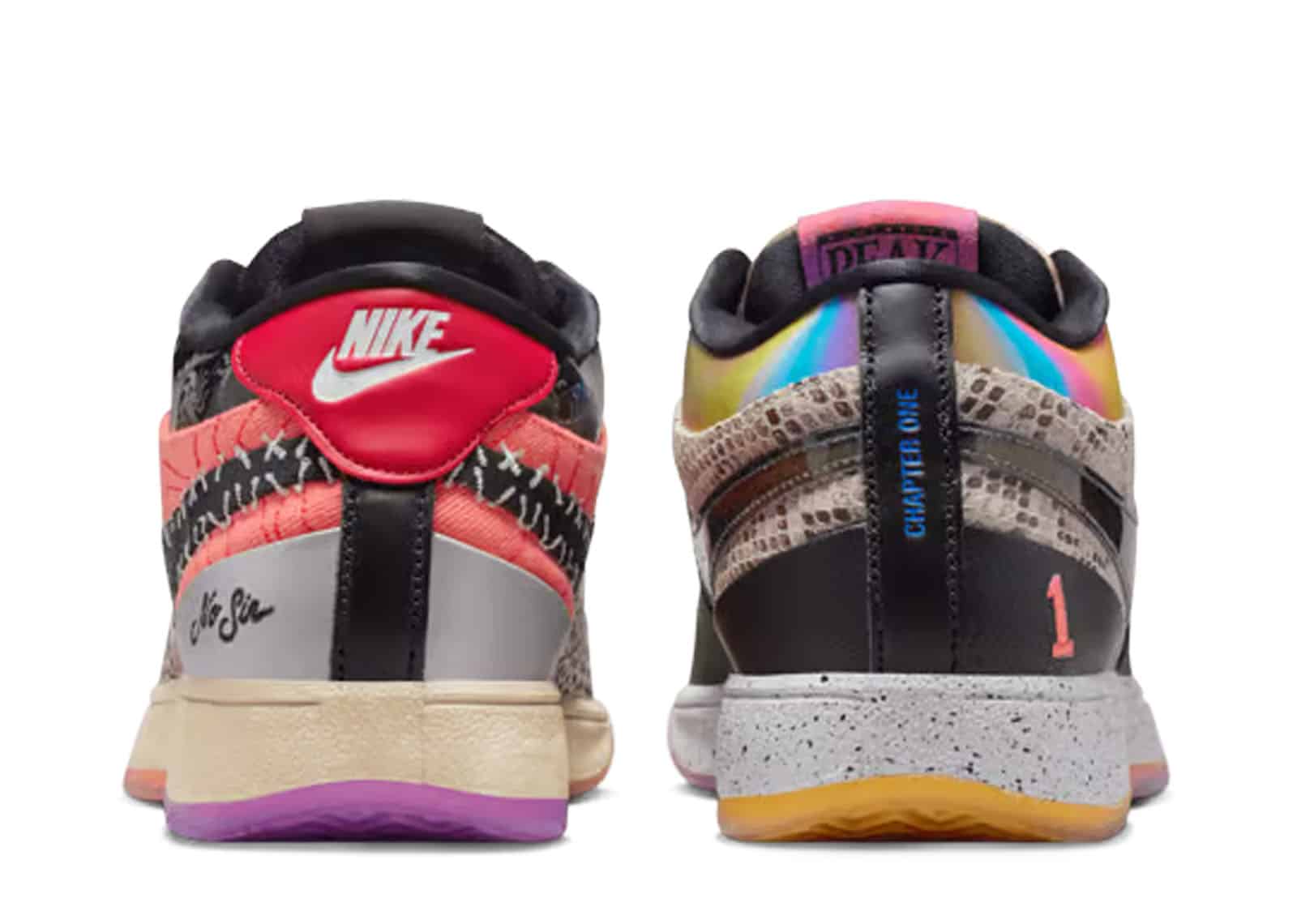 The Nike Book 1 “What The,” which is only available in 1,996 pairs, features a mixed-material construction with designs and mismatched hues inspired by earlier colorways of Devin Booker’s first signature model. The left shoe is distinguished by a black Swoosh encircled by exposed stitching, a Safari-print forefoot overlay, and a yellow hairy suede toe box. A bright red cloth side panel with a topographic map pattern on it contrasts with the latter feature. The right shoe features a green nubuck forefoot overlay with topographic-inspired stitching on top of a blue denim toe box. The midfoot panel is covered in faux snakeskin, and the padded collar has a rainbow-colored lenticular effect. The numbered edition of the shoe is visible on a covert tag attached to the lateral eyestay.