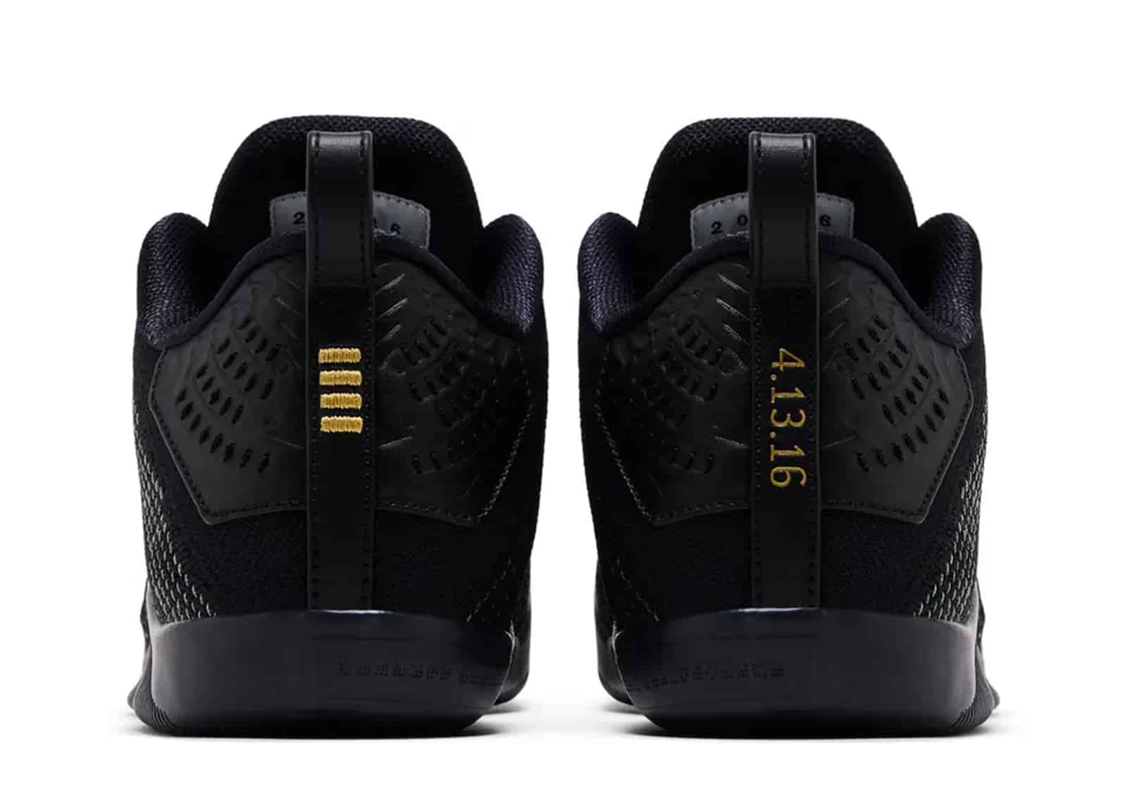 The Nike Kobe 11 Elite Low Protro ‘Fade to Black’ for 2026 revives the sneaker that Kobe Bryant wore during his farewell NBA game on April 13, 2016. The low-top, the last piece in the 2016 “Fade to Black” collection, has a metallic gold Swoosh and a black Flyknit upper. The tongue features Kobe’s iconic Sheath logo, and the right shoe’s heel bears the inscription “4.13.16.” The original Protro edition’s Lunarlon foam cushioning has been replaced with a ReactX drop-in midsole. Responsive cushioning is provided by a Zoom Air unit in the heel.