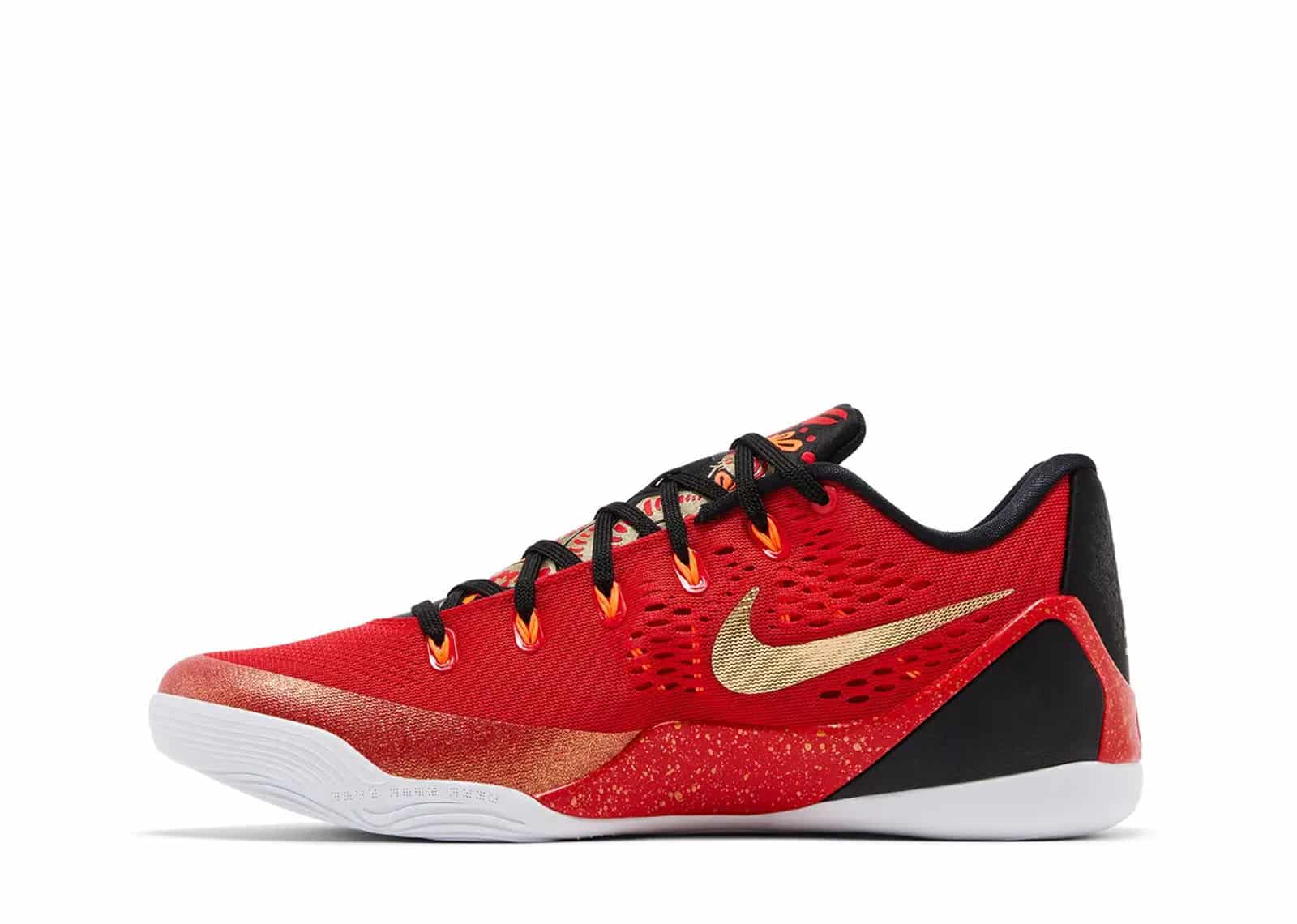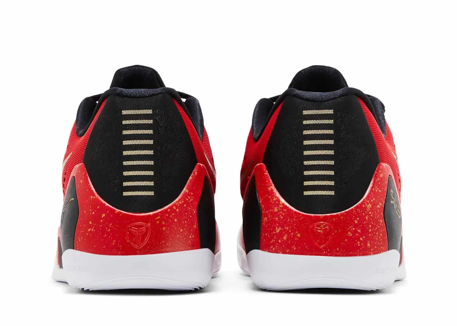 The Nike Kobe 9 Low EM ‘China’ for 2025 revives a colorway from 2014 that honors Kobe Bryant’s relationship with Chinese basketball fans. The bright red engineered mesh upper is adorned with a metallic gold Swoosh, and the lacing system incorporates internal cables for a secure fit. The tongue is adorned with an embroidered floral print and Kobe’s iconic Sheath logo. Carbon fiber plates offer lateral stability, and a drop-in React foam midsole provides responsive cushioning.