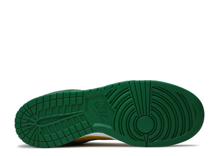 The Nike Dunk Low SP ‘Brazil’ features a simple two-tone colour design that mixes a yellow leather base with contrasting green overlays, emulating the legendary ‘Brazil’ Dunk from 2001. The heel tab and stitched-on woven tag atop the moderately cushioned nylon tongue include Nike logo. A robust white foam midsole supports the low-profile shape, which is reinforced underfoot by a green rubber outsole.